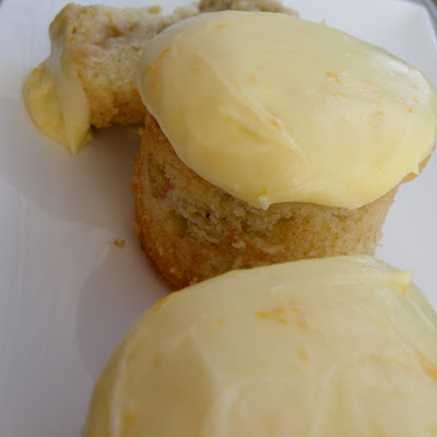 I made this recipe twice last week, because it was that good. That good, but problematic too. The first time, I made a half recipe in a loaf pan, as the recipe called for, and it was delicious, but too tender. Too tender is usually not a problem with cakes, but this was impossible to slice. I ended up bringing a container of icing covered crumbs to school. They were all eaten, as teachers are not that fussy, I guess. Especially when it comes to a soft cake with rhubarb melted into it, leaving behind a tangy flavour. The second time I made it I decided to make individual cakes. I'd call them cupcakes, but I haven't got a cupcake tin, and so I used ramekins, which made for 7 slightly-too-large-for-one serving cakes out of another half recipe. I think you'd get a dozen if you use a regular muffin tin. Or refrigerate your cake for easier slicing. But cold butter cake? It doesn't appeal to me much, as it gets so firm.